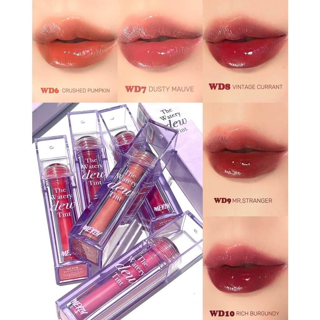 Merzy The Watery Dew Tint là dòng son bóng mới nhất của Merzy, nổi bật với thiết kế thân son trụ vuông dài, trong suốt, đúng chất "The Watery". Dòng son này gồm 3 phiên bản: Ver 1 với 5 màu đầu tiên có vỏ son trong pha hồng cam nhẹ, Ver 2 với 6 màu tiếp theo có vỏ son trong suốt hoàn toàn, và Ver 3 gần đây ra mắt với vỏ son màu xanh mint trong suốt tạo cảm giác mát mẻ. Điểm chung của tất cả các phiên bản là cọ son dài, thẳng, giúp tán son dễ dàng. Chất son nhiều dưỡng, mịn màng, giúp đôi môi mềm mại, với độ bám và bền màu cao.