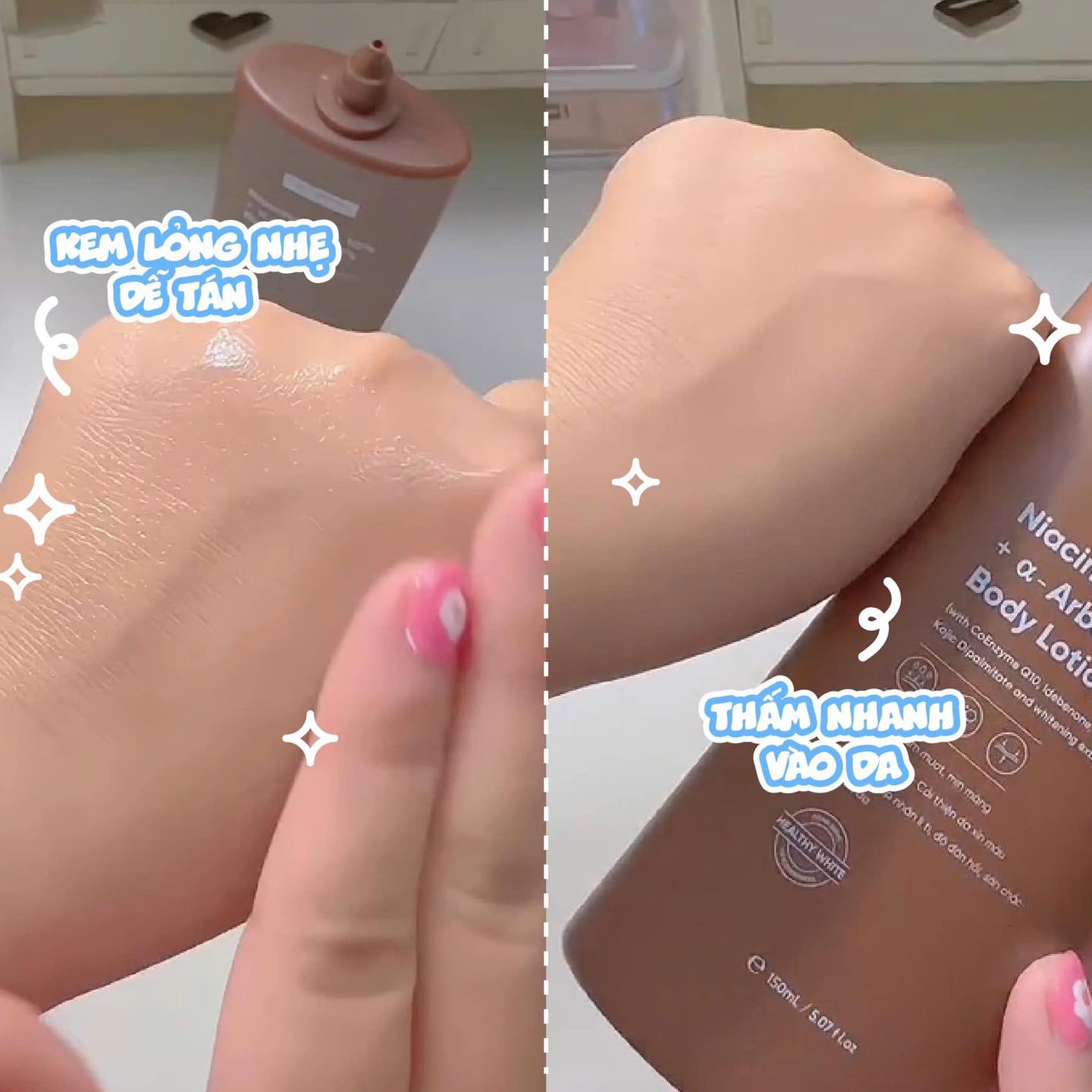 Chất lotion khá lỏng , thấm khá nhanh , không hề bị nhờn rít hay để lại vệt trắng , mùi thơm dễ chịu , có chút giống mùi sữa tắm X-men nhưng nhẹ nhàng hơn . Sau 3 tuần sử dụng , nền da cũng có mềm mượt hơn một chút do có retinol , cũng vì thế mà buổi sáng nên dùng thêm chống nắng cho body để không bị bắt nắng nhé .Mình khá bất ngờ vì khả năng làm sáng da của em nó , kết hợp với tẩy da chết body với em Healthy White này thì da có trắng sáng lên trông thấy , khoảng 1 2 tone so với trước đó, quá đỉnh luôn .