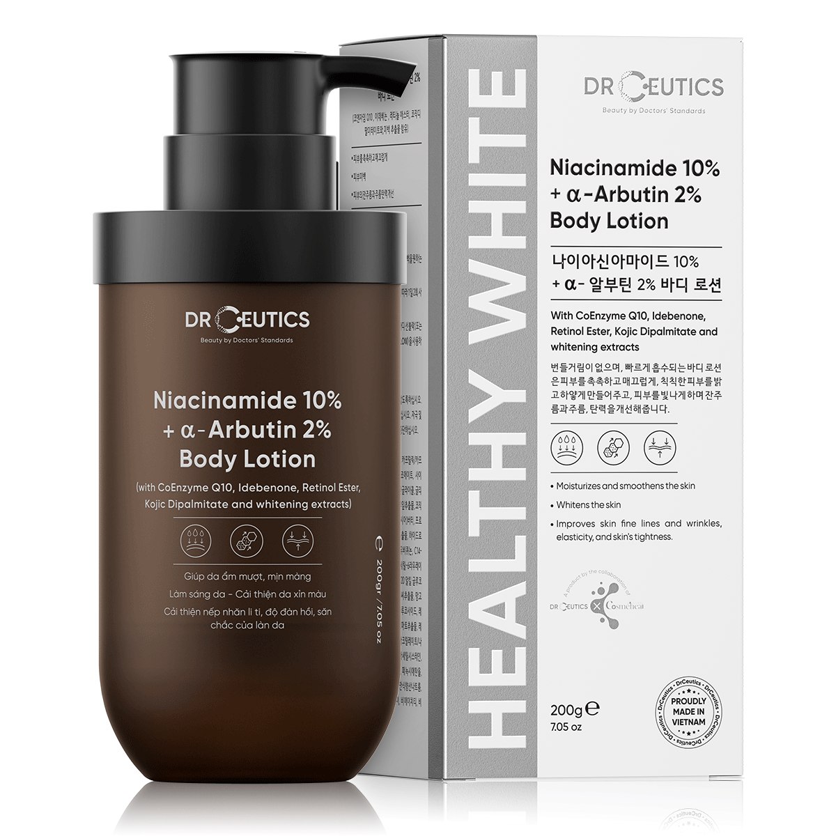 Dòng sản phẩm Sữa Dưỡng Thể Hỗ Trợ Dưỡng Trắng Da DrCeutics Niacinamide 10%+ α- Arbutin 2% Body Lotion với thành phần từ thiên nhiên kết hợp với Niacinamide 10% + α- Arbutin 2% giúp mang lại cảm giác khô thoáng cho người sử dụng, không gây nhờn rít da, đồng thời giúp làn da trở nên mịn màng, cải thiện tình trạng xỉn màu da, giúp tăng độ đàn hồi của da.
