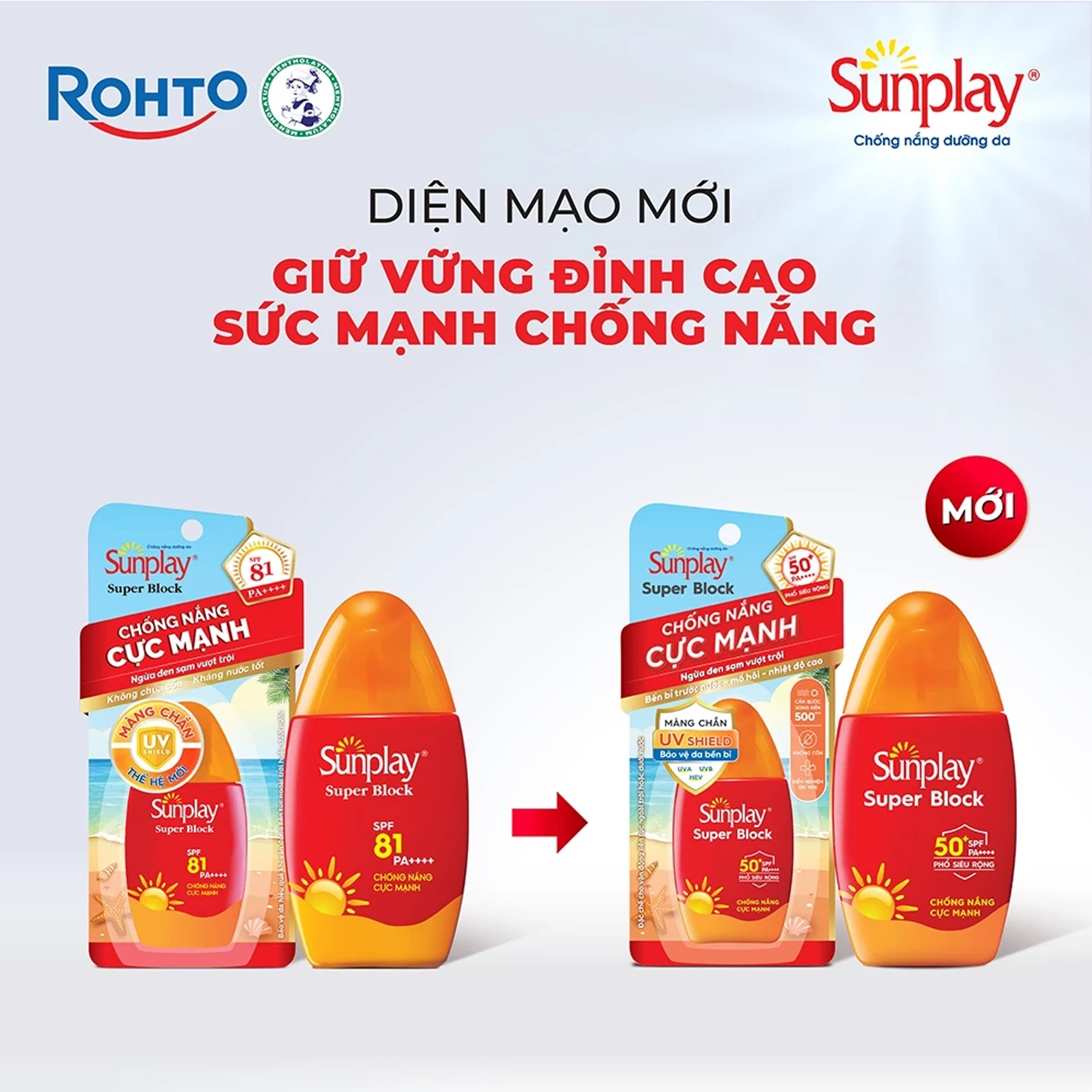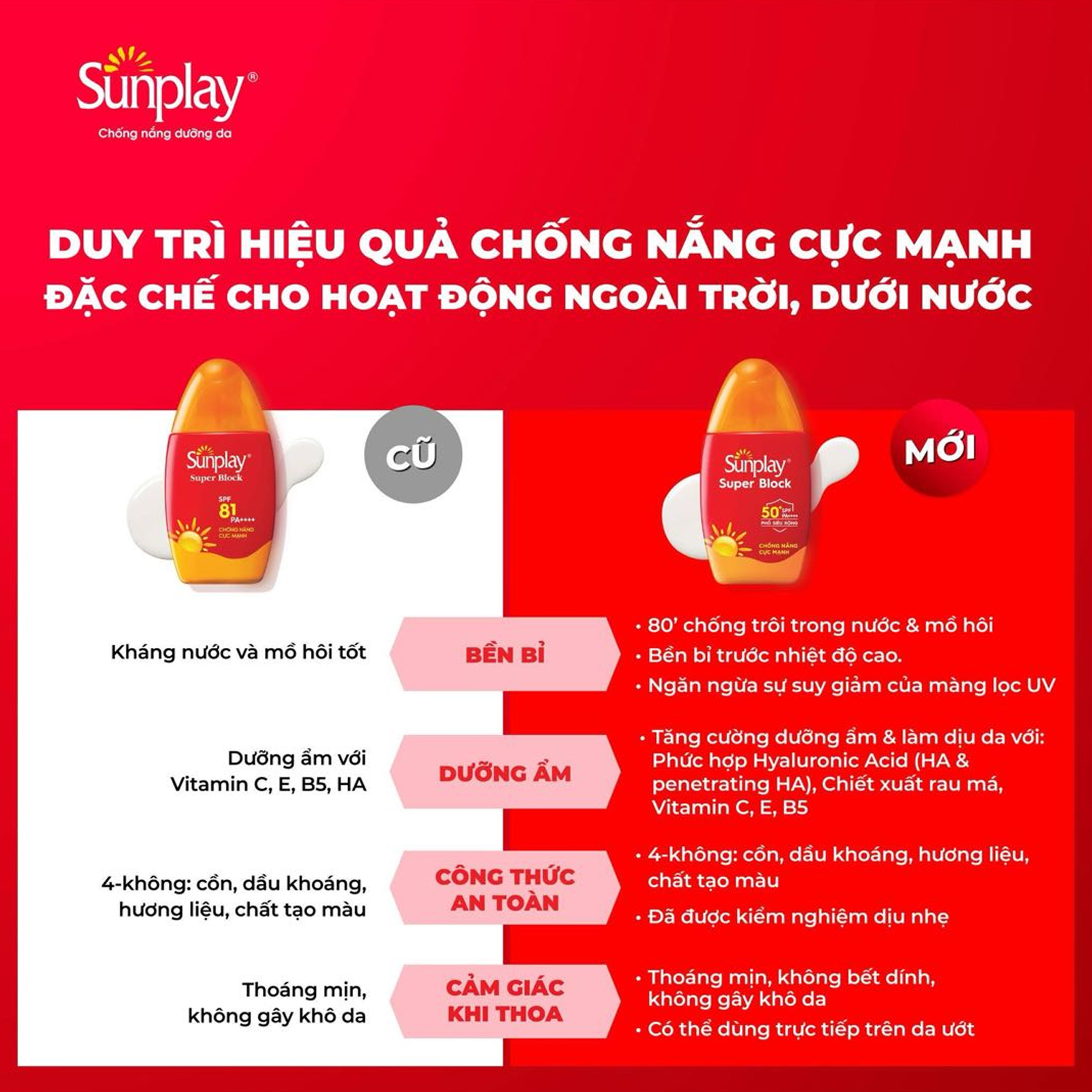 Kem chống nắng chống nước Sunplay SPF50+ lần nay quay lại với phiên bản mới, đổi cách ghi chỉ số chống nắng trên bao bì thành SPF 50+ thay vì hiển thị chỉ số 81+ như trước đây để phù hợp hơn (chỉ số SPF thực tế cao hơn 50 sẽ được ghi chung là SPF 50+)