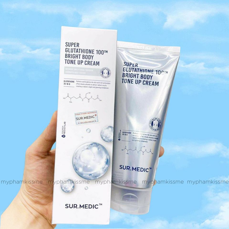 - Kem Dưỡng Thể Trắng Da Nâng Tông Sur.Medic+ Super Glutathione 100TM Bright Body Tone Up Cream với công thức bổ sung Vitamin C, Glutathione, Niacinamide và các thành phần có nguồn gốc từ thực vật giúp nuôi dưỡng làn da trắng sáng từ bên trong, cấp nước giúp da luôn ẩm mịn và tạo màng bảo vệ ngăn ngừa ung thư da.