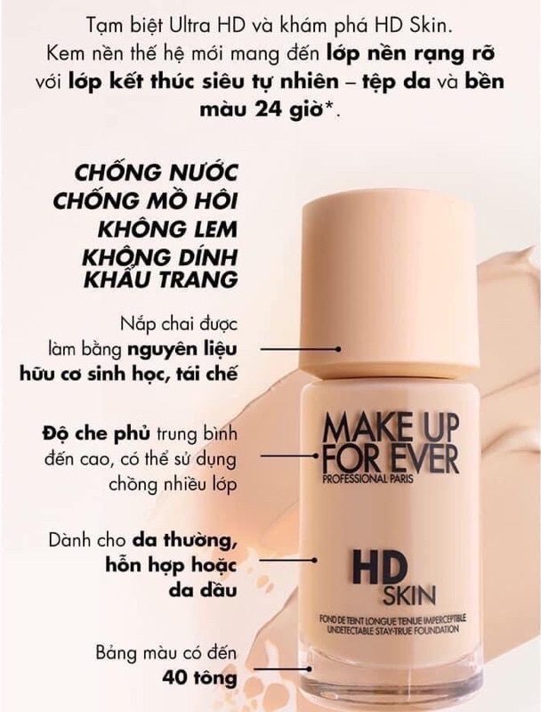 Kem Nền Make Up For Ever HD Skin là phiên bản nâng cấp tuyệt vời của dòng sản phẩm đình đám Ultra HD Foundation, giúp mang lại lớp nền rạng ngời và tự nhiên một cách xuất sắc. Sản phẩm có khả năng chống nước và mồ hôi, không lem, không trôi, không bám vào khẩu trang, giữ màu bền suốt 24 giờ mà không bị xỉn. Kết cấu kem mỏng nhẹ, cùng lớp nền bán lì semi-matte tạo hiệu ứng tự nhiên ngay cả khi không sử dụng kem lót.