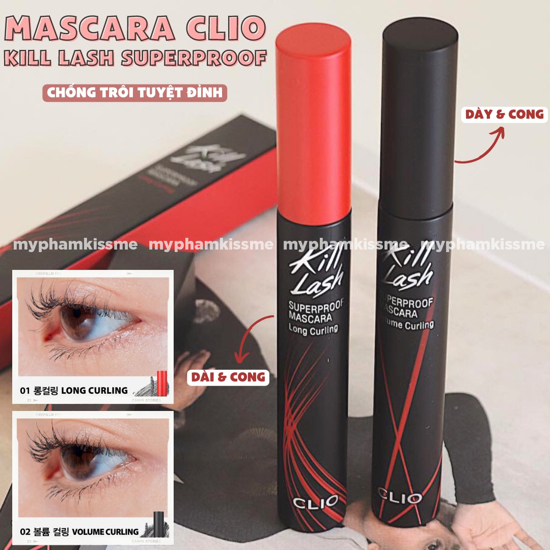 - Clio Kill Lash Superproof Mascara cho hiệu quả làm cong mi từ gốc đến ngọn, kích thích mi dài và cong tự nhiên.
