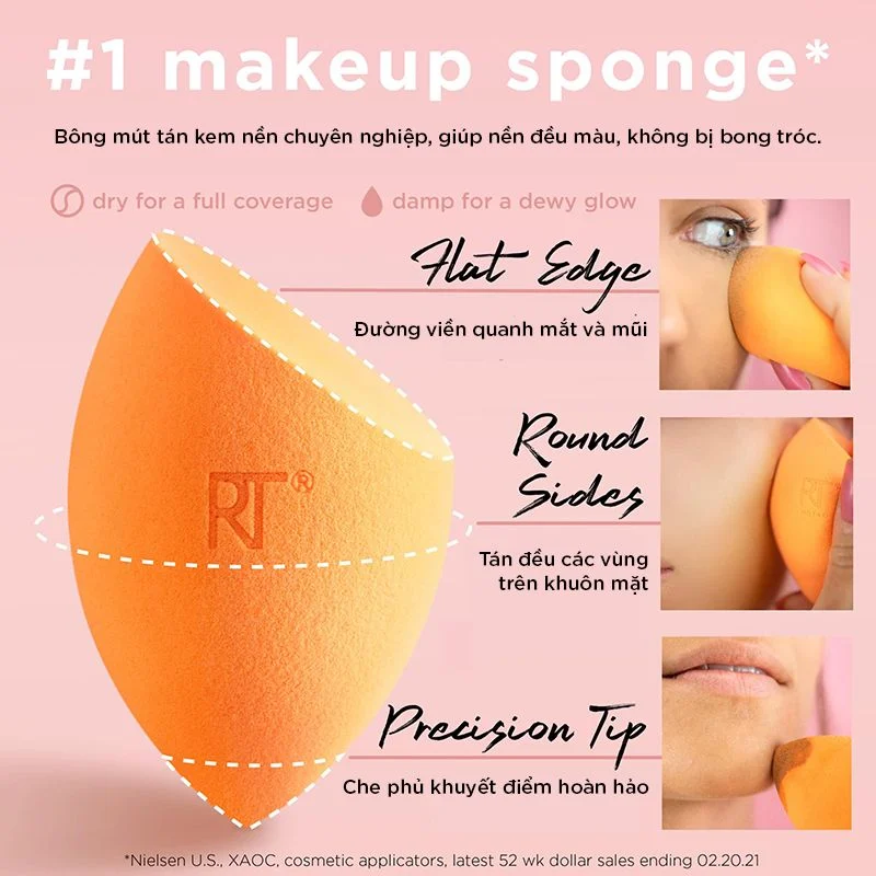 - Mút tán kem nền Real Techniques với khả năng hút kem tốt và chất liệu mềm mại, xị em có thể trang điểm nhanh gọn lẹ không một chút khó khăn. Độ đàn hồi cao chắc chắn sẽ đem lại cho các nàng một lớp nền hoàn hảo không tì vết.