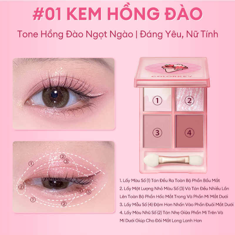 Tạo hiệu ứng trang điểm mắt đa dạng: Bốn ô màu phối hợp độc đáo trong bảng phấn mắt Colorkey Four Colour Eyeshadow Pinky Icecream giúp bạn dễ dàng tạo nhiều kiểu trang điểm mắt khác nhau, từ năng động hàng ngày đến ấn tượng cho buổi tiệc.