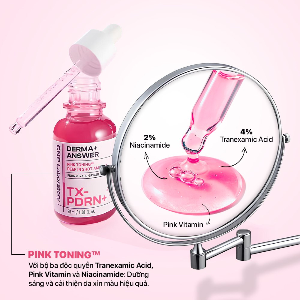 Tinh chất CNP Derma Answer Pink Toning Deep-in Shot Ampoule giúp đánh thức làn da xỉn màu và hư tổn với công nghệ đột phá từ CNP. Pink Toning Deep In Shot Ampoule không chỉ làm sáng da tức thì mà còn đi sâu vào tế bào để sửa chữa các tổn thương nhờ thành phần PDRN quý giá. Làn da sẽ trở nên căng bóng, hồng hào và đều màu hơn chỉ sau một thời gian sử dụng