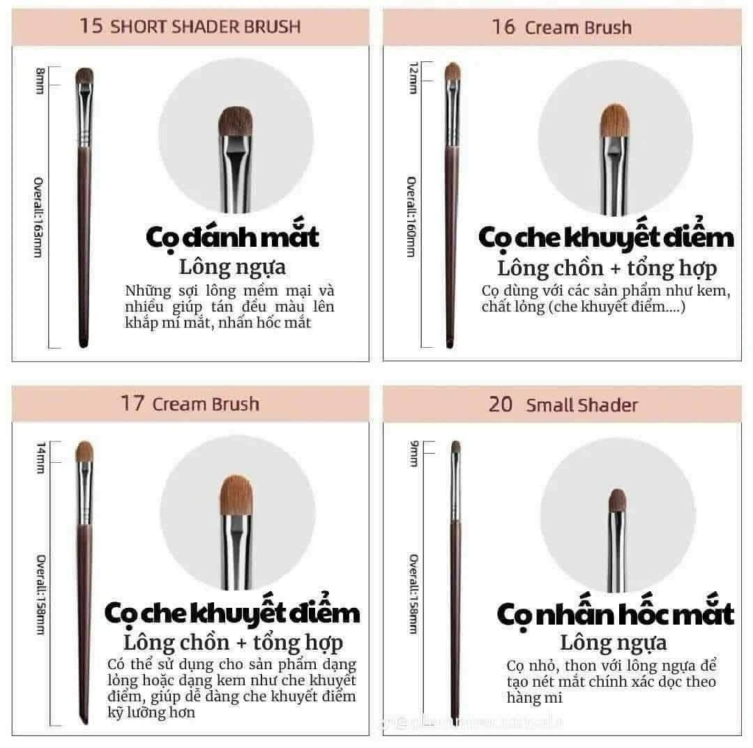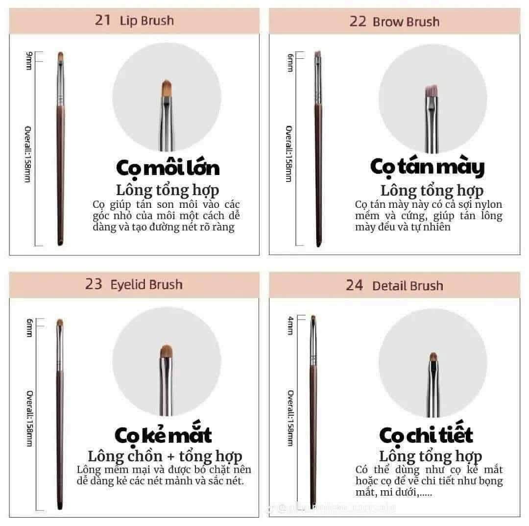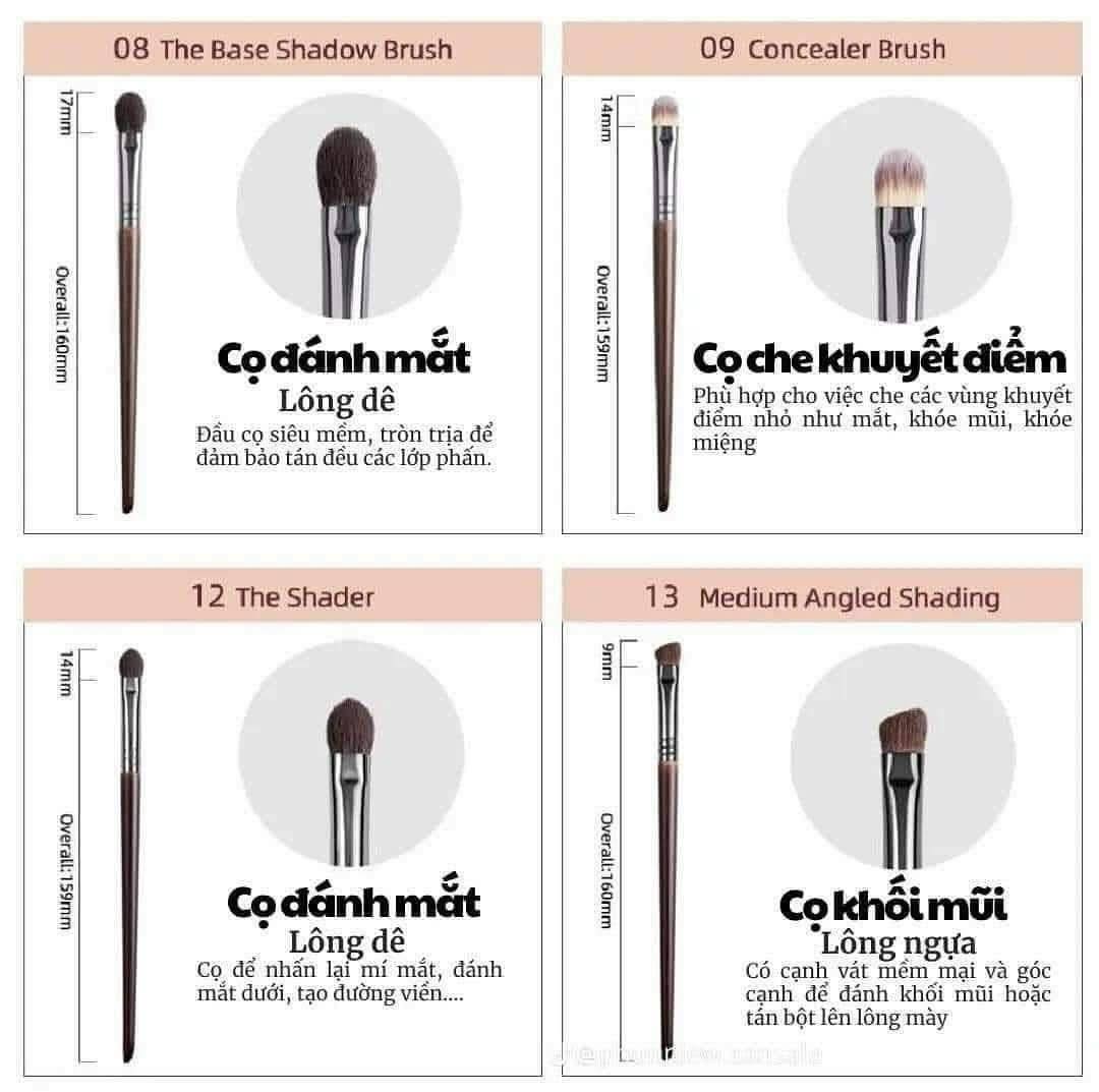 - Đa dạng và đầy đủ: Bao gồm 14 loại cọ, đáp ứng mọi nhu cầu trang điểm từ cơ bản đến nâng cao.