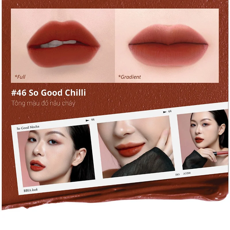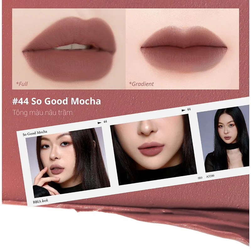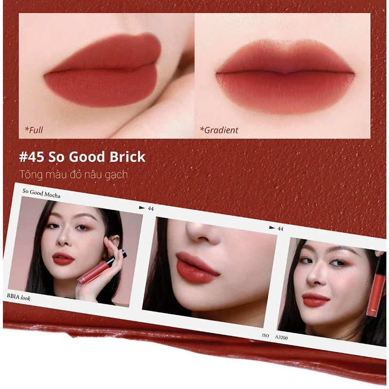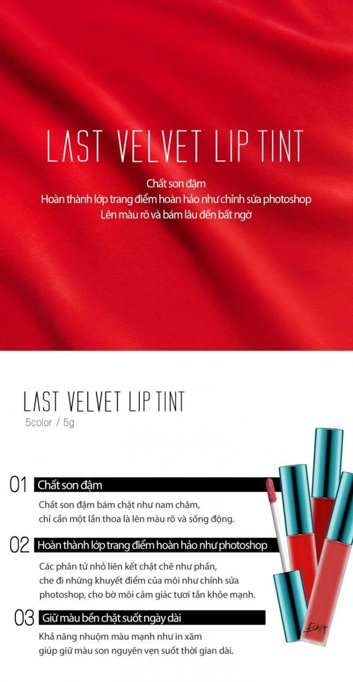 Son Kem Lì, Lên Màu Siêu Chuẩn Bbia Last Velvet Lip Tint là dòng son kem lì của thương hiệu Bbia, với nhiều phiên bản son liên tục được hãng cho ra mắt, thương hiệu Bbia cực kỳ nhanh nhạy khi nắm bắt xu hướng màu son hot nhất hiện nay với bảng màu vô cùng thời thượng. Son lì nhưng mịn như nhung, rất nhẹ và mướt môi, không làm khô môi hay lộ vân môi, lớp finish lì tuyệt đối nhưng sau khi ăn sẽ để lại lớp màu hồng đỏ tiệp lại trên môi cực xinh. Sản phẩm có nhiều màu với những Version khác nhau vô cùng thời thượng, phù hợp với nhiều tone da.