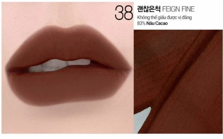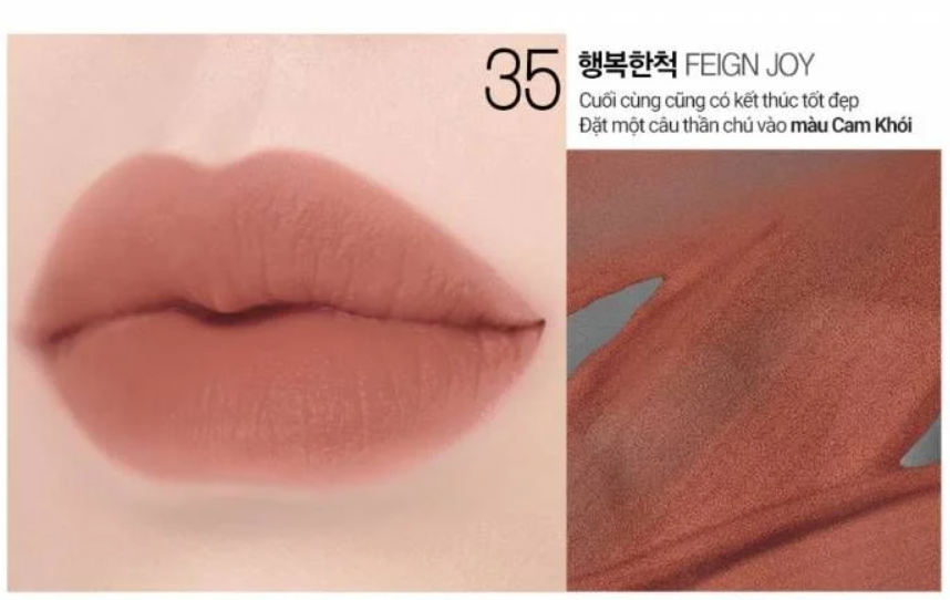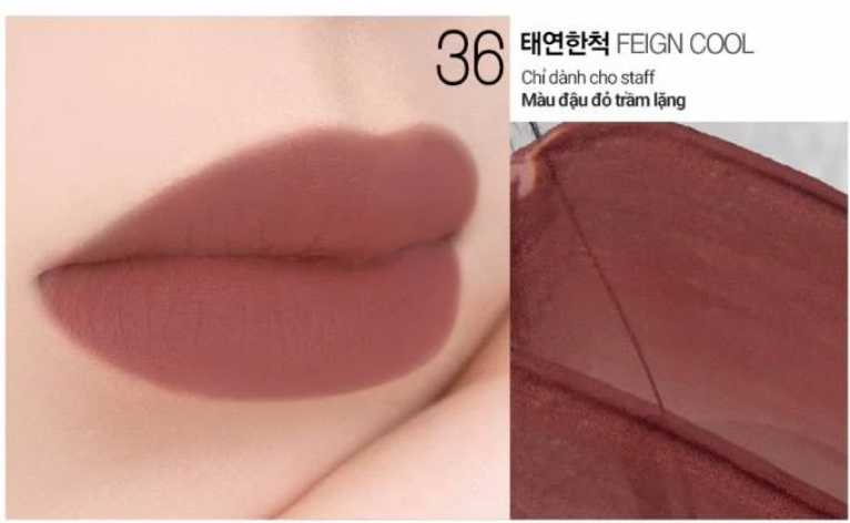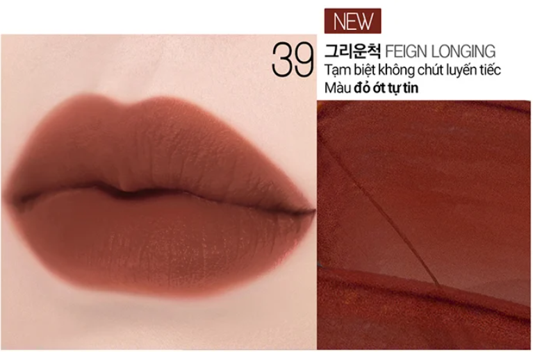 Kết cấu: Son có kết cấu son lì nhưng mịn như nhung, rất nhẹ và mướt môi, không làm khô môi hay lộ vân môi, lớp finish lì tuyệt đối nhưng sau khi ăn sẽ để lại lớp màu hồng đỏ tiệp lại trên môi cực xinh.