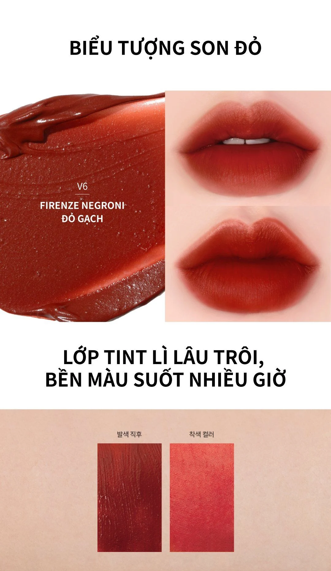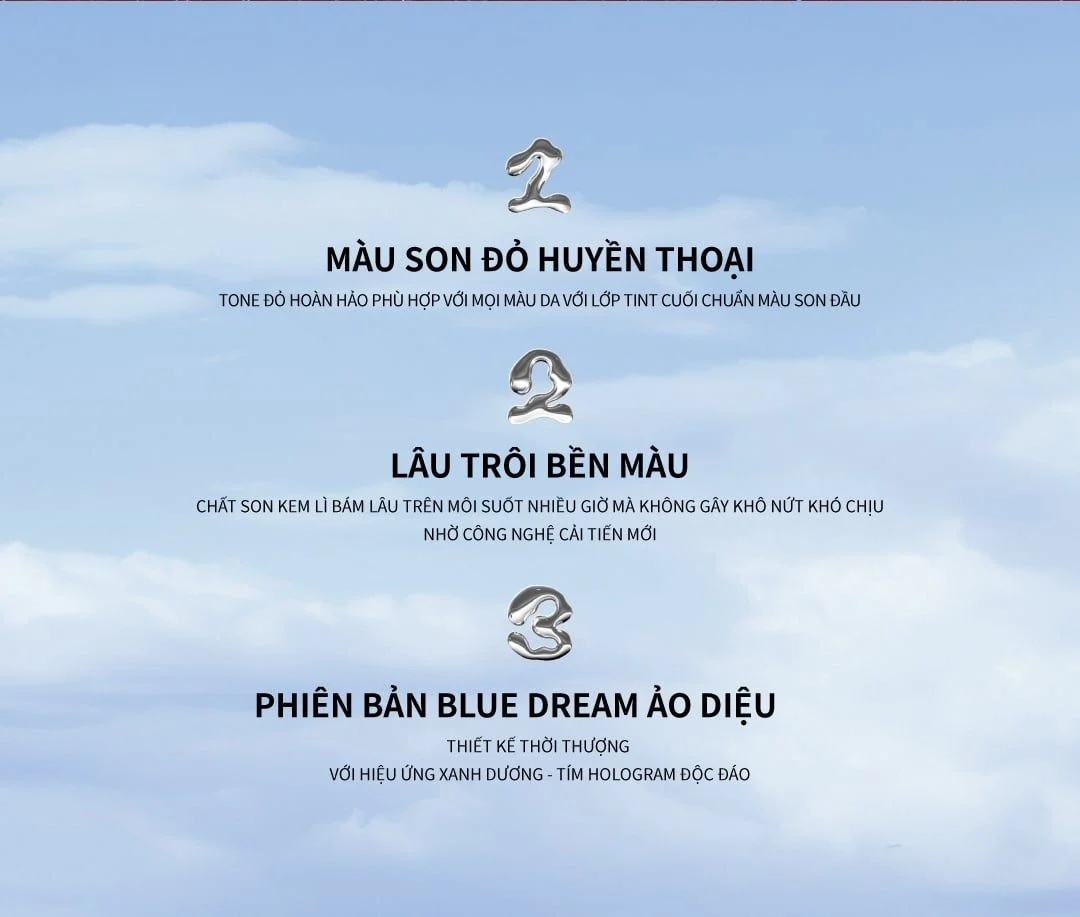 - Tone màu đỏ huyền thoại phù hợp với mọi tone da Việt và hợp mọi phong cách. Lớp tint cuối V6 Blue Dream chuẩn màu son đầu