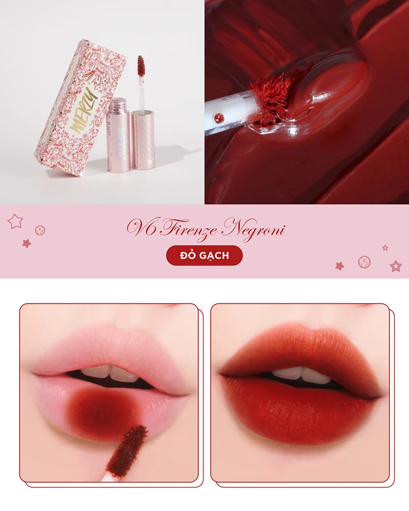 - Tone màu thời thượng: Là phiên bản thứ 5 của Merzy V6 với slogan huyền thoại "THE LEGEND OF RED" nhờ sự kết hợp hài hòa tạo nên tông màu đỏ gạch huyền thoại phù hợp với mọi tông da của người tone da Việt và hợp mọi phong cách.