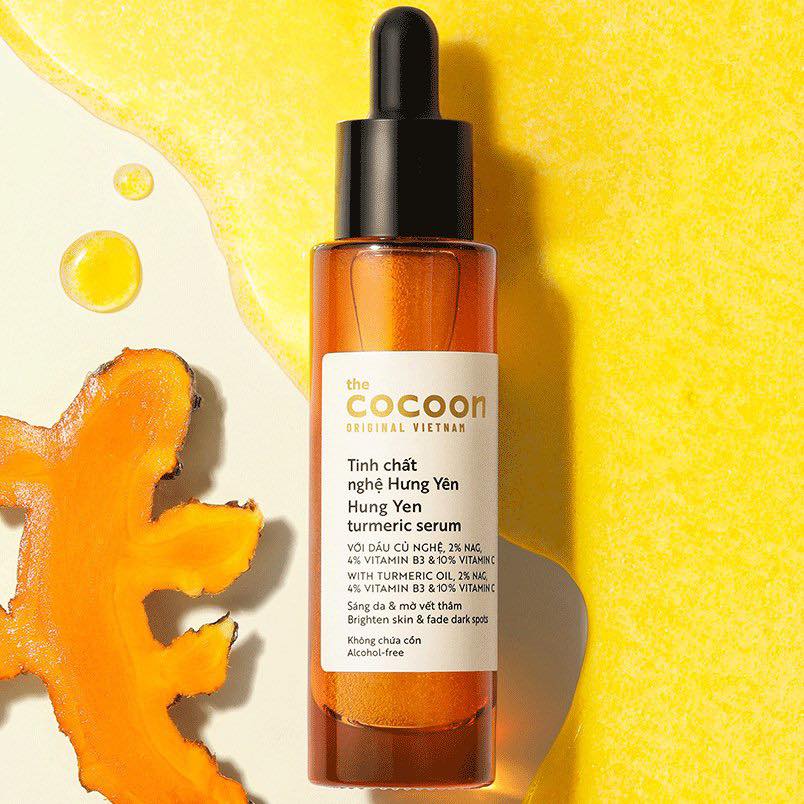 • Tinh Chất Nghệ Hưng Yên Cocoon hội tụ của các thành phần: dầu nghệ Hưng Yên giàu turmerone, 10% Vitamin C (3-O-Ethyl Ascorbic Acid), 4% Vitamin B3 (Niacinamide) và 2% NAG (N-Acetyl Glucosamine) có công dụng: